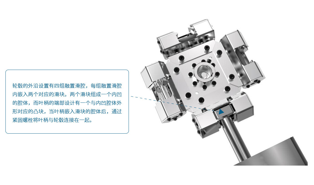 | E | 輪轂外沿4組滑孔內的不規則形狀滑塊,限制葉片上翹范圍 The sliders inserted in the cylinders to limit the range of up & down of the blades | ■ | ■ | ■ | |